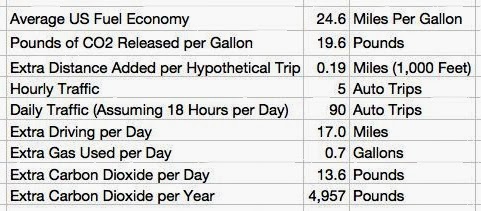 • More vehicle miles travelled. Each lost link in the system causes somebody to drive a little farther than they otherwise would have. In isolation, this isn't a big deal, but in the aggregate it is a big environmental problem. Here's an example: Let's say that one block of one street is blocked off in a neighborhood. Let's say that it was a lightly travelled block, with only 5 cars using it per hour, over 18 hours of the day. I'll assume that each car has its trip lengthened by just 1,000 feet as they go around the new obstacle. No big deal, right? Well, with the average US car getting , and with the burning of a gallon of gasoline releasing into the air, the loss of this one link in the neighborhood could result in up to 5,000 pounds of extra carbon dioxide in the atmosphere per year. Is it worth it?