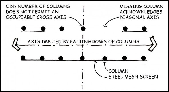 Architecturally the use of two parallel rows of columns creates an axis — in this case “an axis to nowhere.” This error is exacerbated by the addition of steel scrim tapestries that connect the rows of columns along the north and south sides, further reinforcing the east-west axis, which is open, thus looking outward at nothing of merit. Lush vegetation is gratuitously incorporated at the two ends to minimize the error.