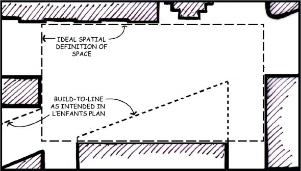Gehry’s design intention — to create a defined square within the boundaries of the site — violates the L’Enfant plan, which places 4 symmetrical squares around the Capitol, much like William Penn’s plan for Philadelphia. By striving to create an additional square within this framework, the simplicity, elegance, and intention embodied in the original plan are compromised.