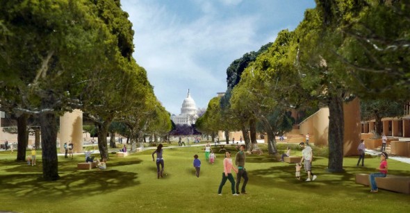 First, Rybczynski attests that the "memorial would not sprawl over the entire site...." Yet images clearly show assorted ramps and steps, inscribed stone walls, scattered stone rectangular solids with people sitting on them (benches?), dozens of improbably gargantuan trees randomly strewn about, two massive cubes with overly blown-up, oppressively large photos carved into them, and of course, the controversial boy-sized statue of a seated boy (that’s Ike) idling on a ledge.
