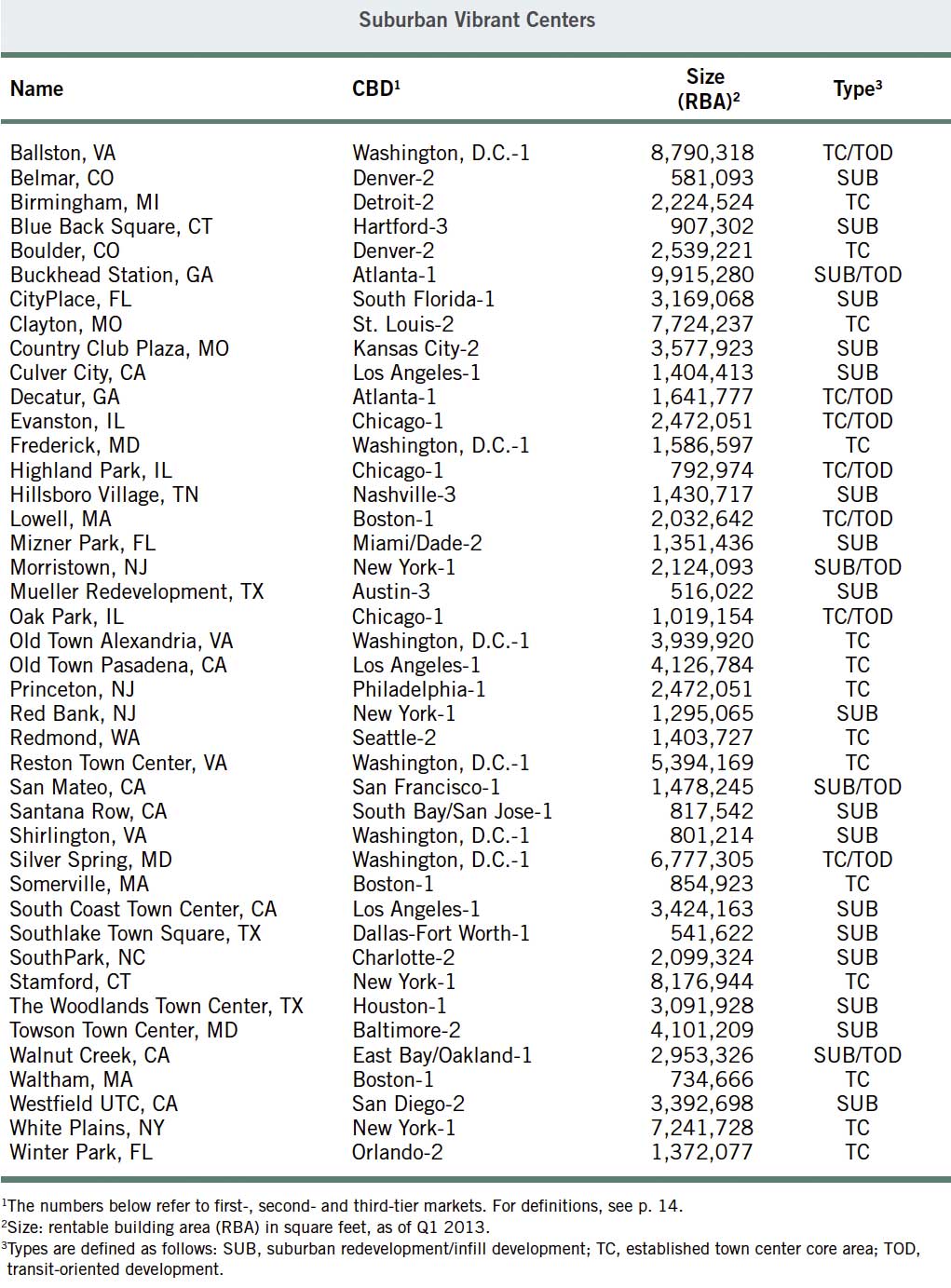 The report compares central business districts (CBDs) with their suburban areas in the 45 largest office markets in the United States. The report also analyzes 42 suburban vibrant centers compared to either nearby suburban office parks or the remainder of the office submarket. Some of these mixed-use centers are in smaller markets. Personal interviews support and add nuance to the data—largely provided by the CoStar Group.