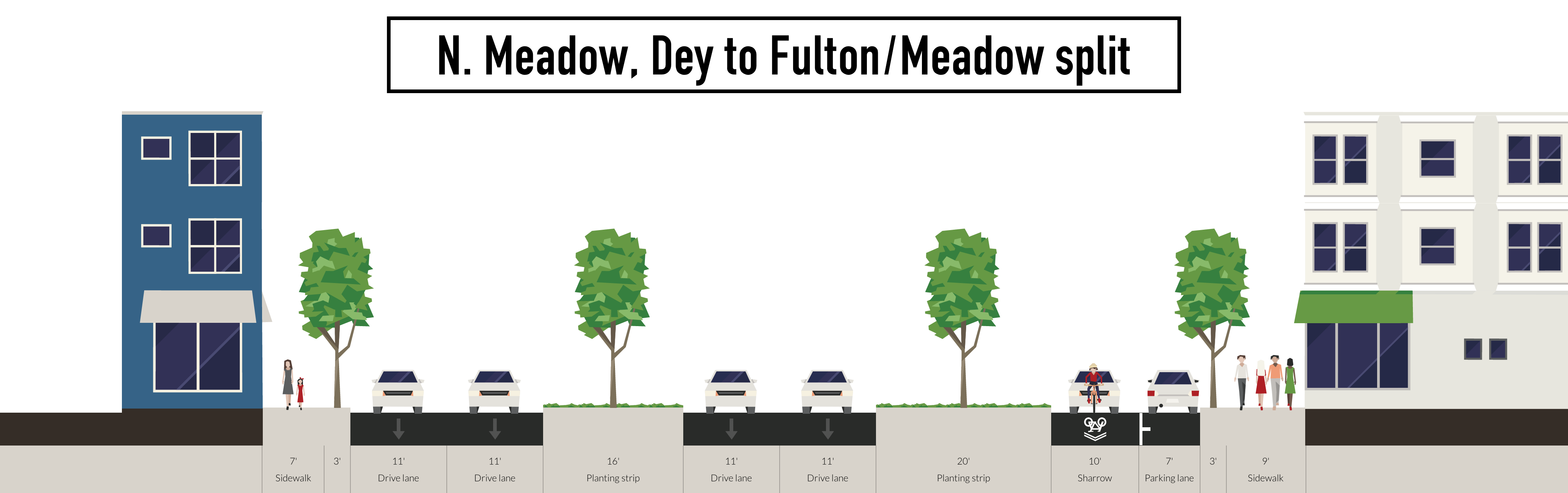 After the first intersection, Dey Street, a slip lane is added to the section for slow local traffic and bicycles. On-street parking would serve urban commercial frontages with sidewalks and more street trees. Additional street connections would make the blocks shorter:
