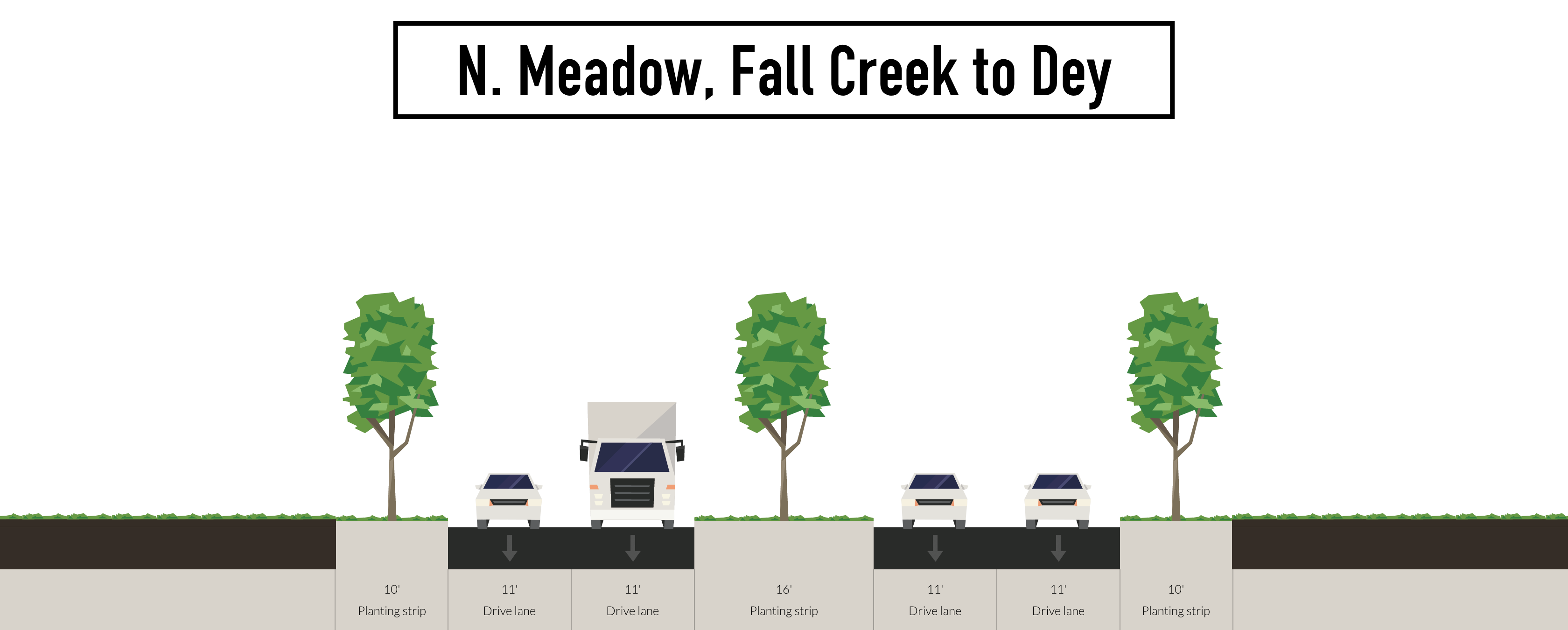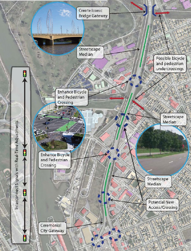 After the bridge, the strategy calls for narrowing lanes to 11 feet to slow traffic and creating a central boulevard planting strip—with trees: