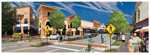 The ideal "Complete Street" with accommodations for pedestrians, bicyclists, transit, and automobiles. Courtesy of AARP Bulletin