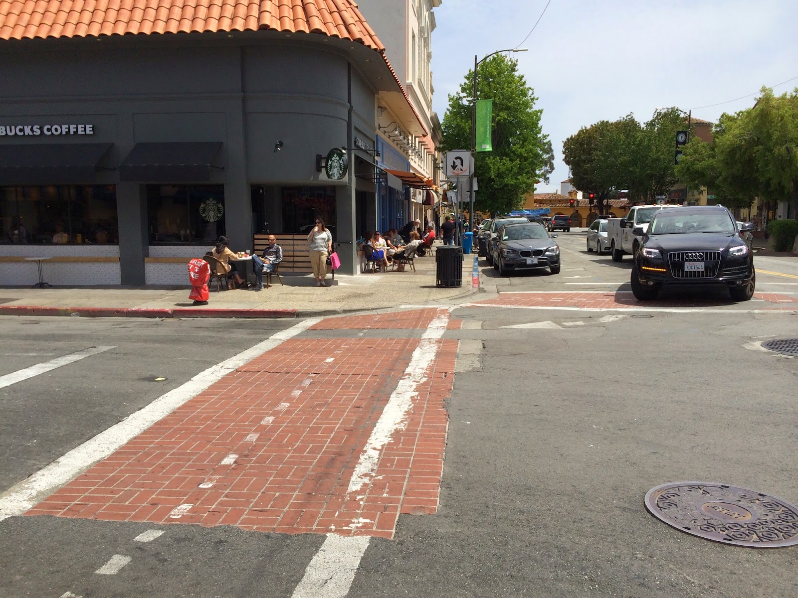 On the upside, the tactile strips at the corner match the color palette and look good, and the corner radii are pretty tight, which will slow down cars that are making right turns. Also, no turn lanes were provided, which would have helped cars at go faster at the expense of parking and sidewalk space. It is a mistake that is made on many downtown main streets, but which Burlingame wisely avoided.
