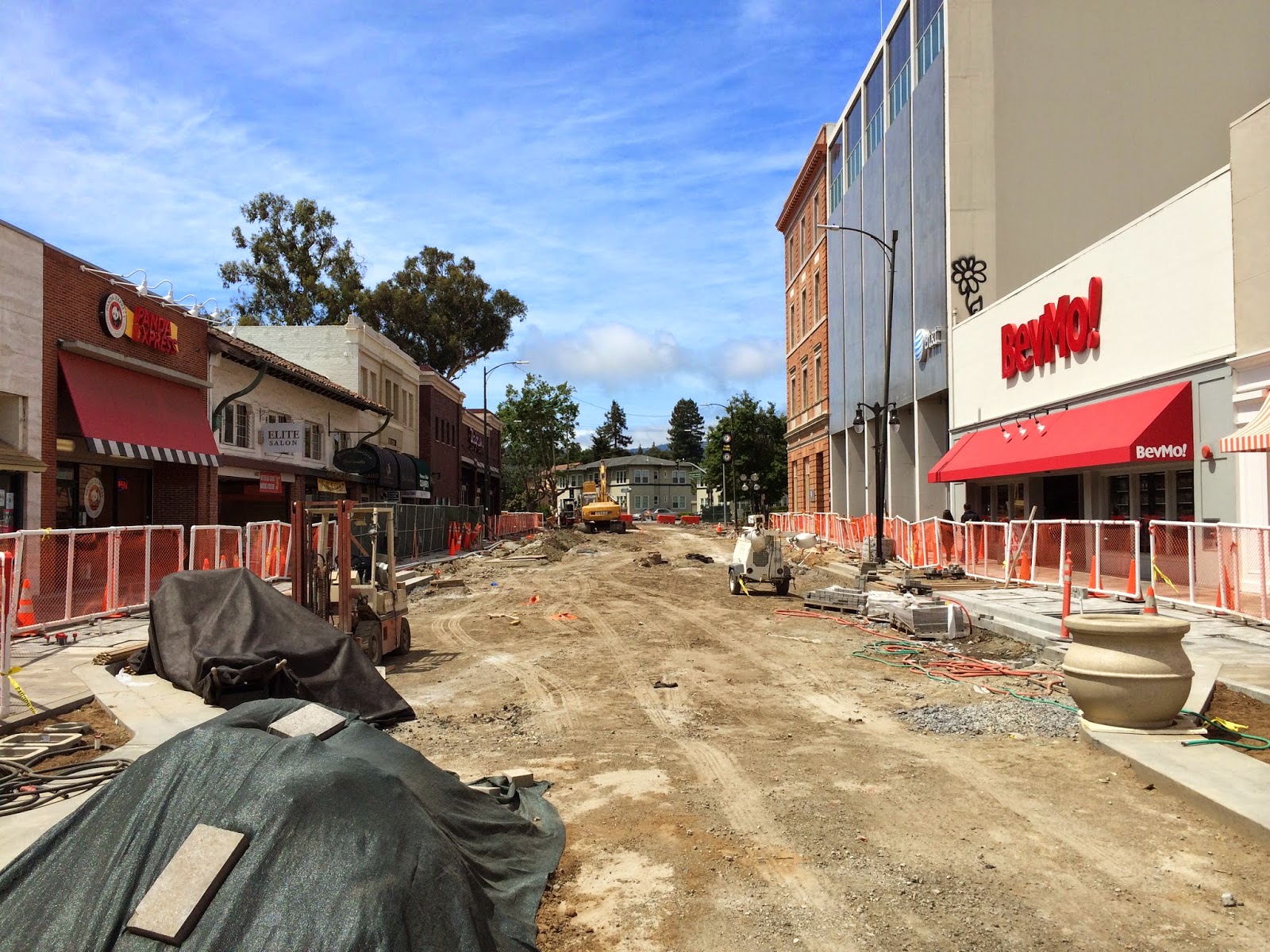 At the other end of the street, near El Camino Real, work is ongoing. Making such dramatic improvements requires wholesale destruction of the street, and this can be quite traumatic for the area and its businesses. It is always a challenge to provide access to the businesses and to coax visitors into areas that look like this. Such problems are temporary, though, and dealing with them is usually worthwhile in the long run.