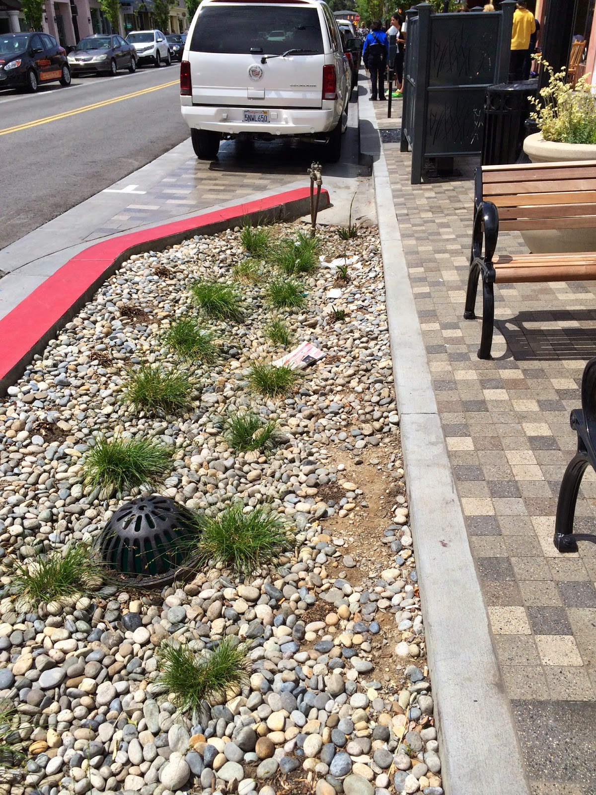 The bulbouts at the corners feature a system meant to absorb as much storm water into the ground as possible without putting it into the storm drain system. If you must do something to accommodate NPDES rules, then this isn't such a bad way to go. For my taste, though, I would prefer more pavers in this area, or maybe another parking space.
