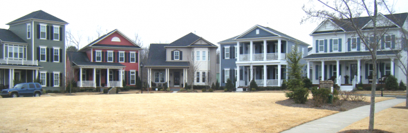 3.) The production line efficiency of stamping out off-the-rack buildings limits the value of New Urbanism. The Town of Belmont’s clustering of new development into small pods with connected, properly-sized streets and alleys is an important step in the right direction. However, when compared to the Antiquity at Cornelius development, where a series of building styles varies from building to building, Belmont pales. While Cornelius does not exhibit an infinite variety of architectural styles from house to house, even a mild variety in housing types here makes a dramatic difference in the sense of place. It chips away at the “Disney-esque” feeling that New Urbanism is sometimes accused of creating.