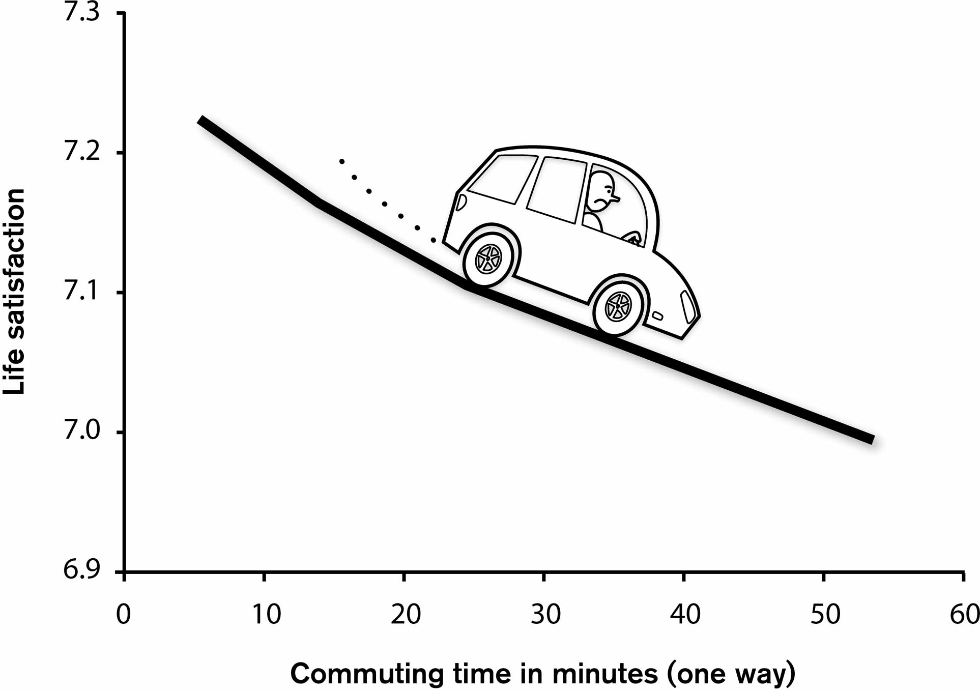 Data from the World Values Survey and the Gallup World Poll show that “when it comes to life satisfaction, relationships with other people beat income, hands down,” Montgomery reports. Want numbers on that? Montgomery says University of Zurich economists Bruno Frey and Alois Stutzer have found that “a person with a one-hour commute has to earn 40 percent more money to be as satisfied with life as someone who walks to the office.” (See graph at top).