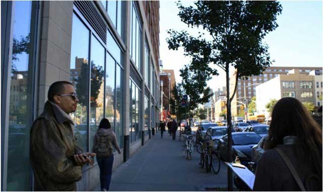 East Houston Street, New York City: People reported feeling happier along the messy by active street front on top than they did along the orderly but blank facade at bottom. Top photo: Charles Montgomery. Bottom: Alexandra Bolinder-Gibsand. .