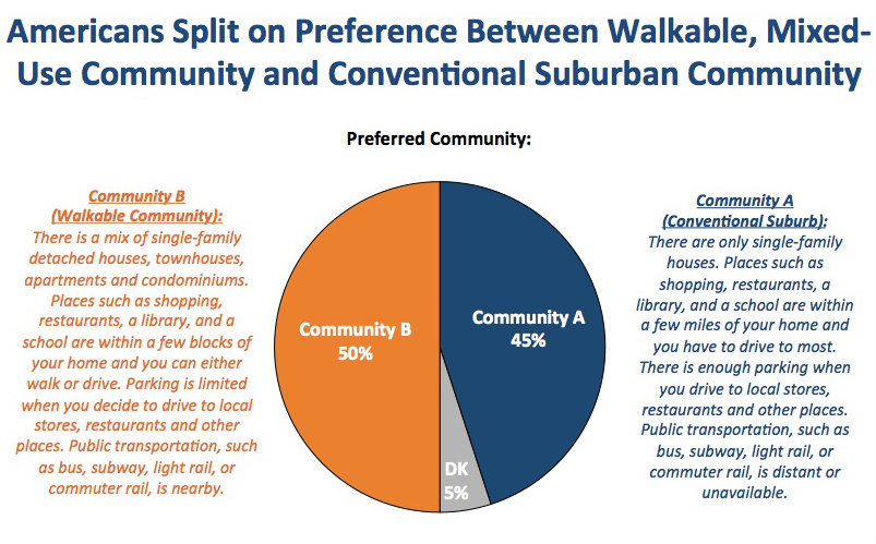 Americans are split in preference for the walkable community on the left and the conventional suburb on the right, according to a graph from the survey. The slight edge goes to the walkable urban place, Community B.