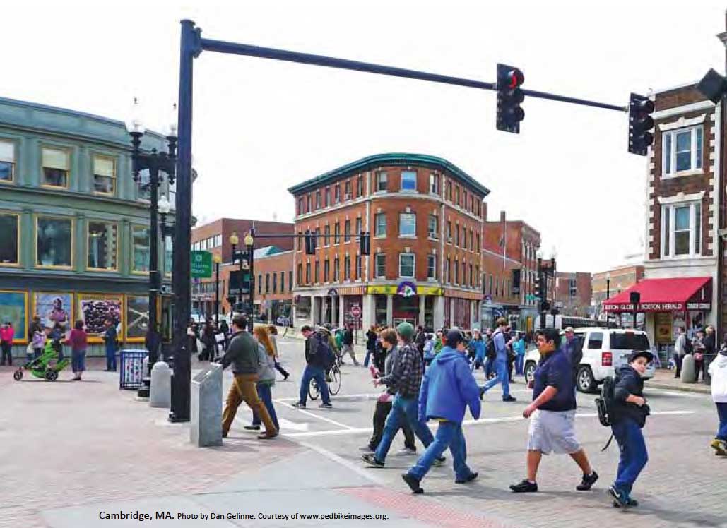 People walking in Cambridge, MA, from Biking and Walking in the United States. Photo by Dan Gelinne, courtesy of pedbikeimages.org.